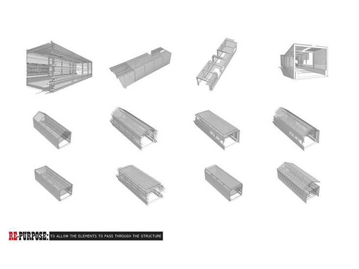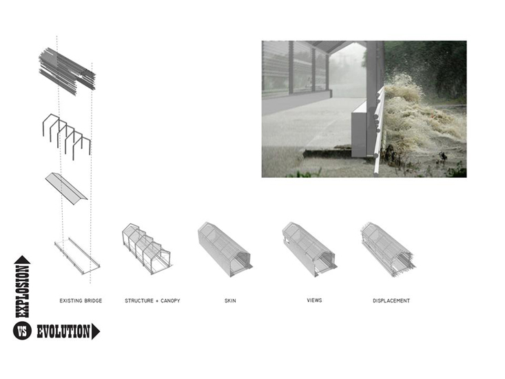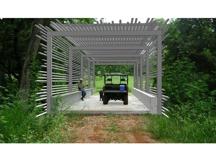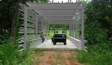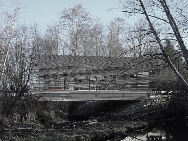 The project brief called for the transformation of an existing concrete and steel bridge into a covered bridge. We found two factors that informed our solution: First, traditional covered bridges were built to protect the wooden structures from the elements. Second, the creek has flooded over the bridge three times in the last five years. We concluded the most relevant solution would be to create a permeable cover that allows for the incursion of flood waters. The final bridge will be clad in recycled tube steel mounted on a steel skeleton allowing the water to continue passing over and through the bridge during moments of extreme flooding.